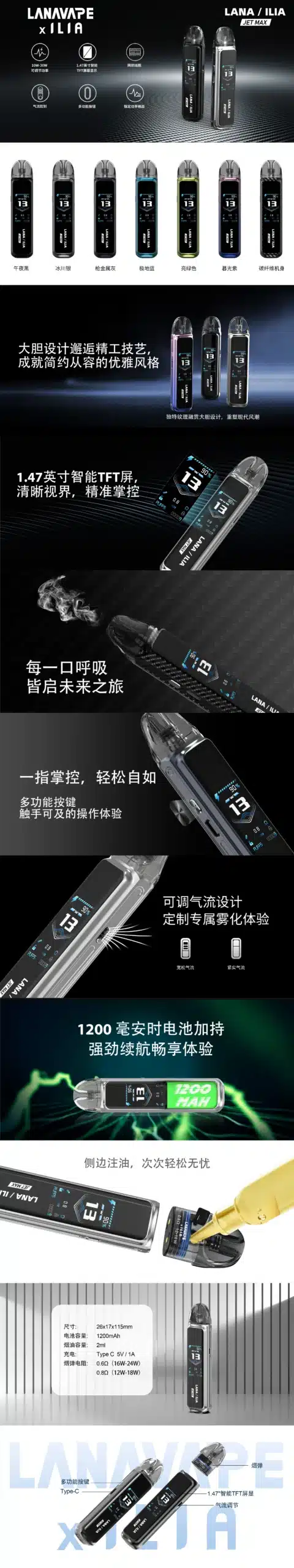 LANA / ILIA Jet Max 電子煙套裝主機(内含空倉0.6Ω+0.8Ω各1)專為追求煙霧量與穩定輸出的玩家打造,結合側注油結構與智慧功率調節系統,帶來更便利、更乾淨且高效的使用體驗。無論日常使用或進階玩家,都能輕鬆駕馭不同煙油類型,展現細膩風味與濃郁煙霧。