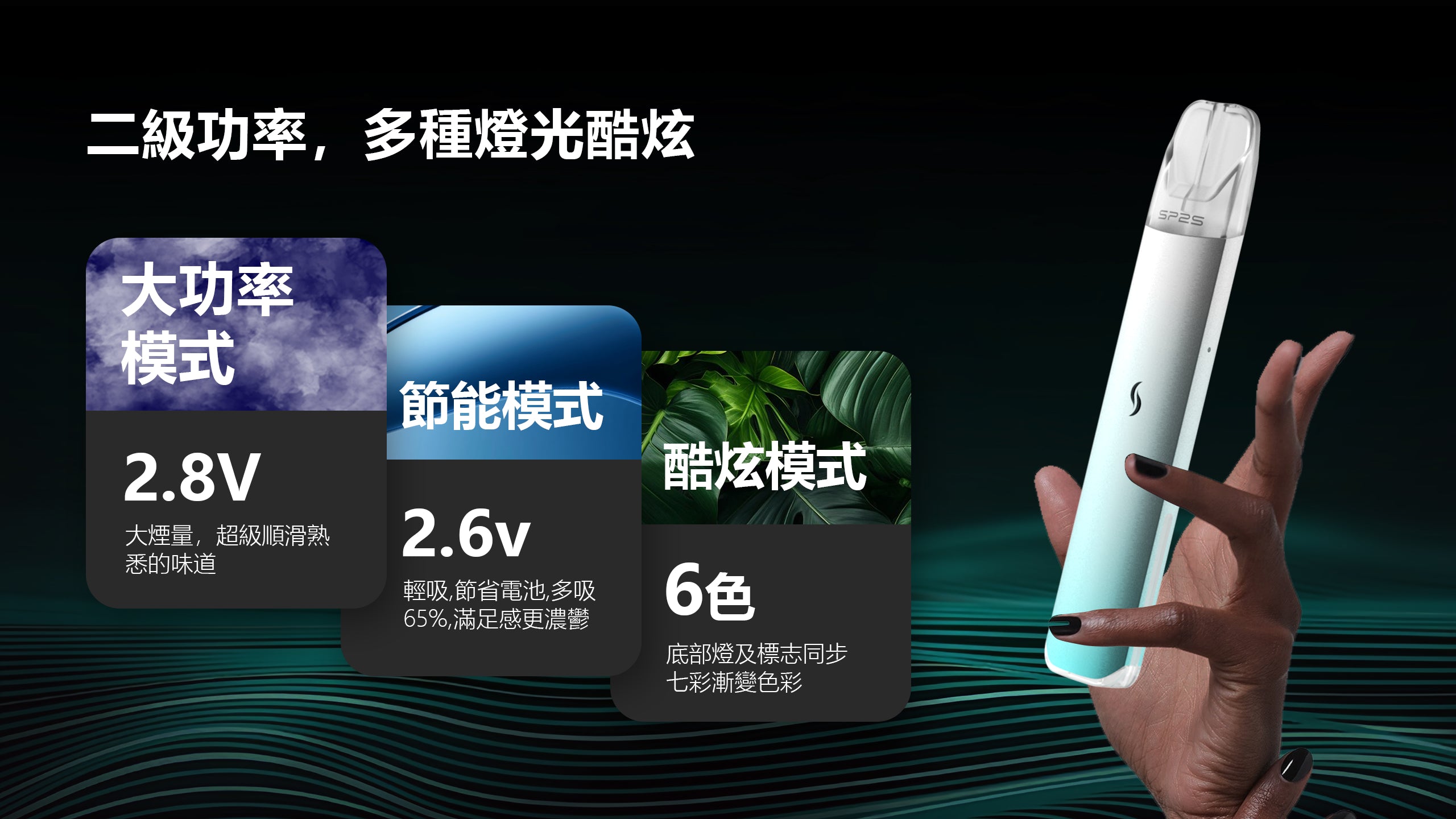 SP2S PRO電子煙主機專為SP2煙彈設計,可調節式主機功率,配備大容量電池,極速充電,採用多種吸睛色彩,不但手感舒適,還高度提升您的品味。sp2s pro 電子煙主機在底部加入炫彩奔流的燈光,潮流新奇的vape觀感體驗。